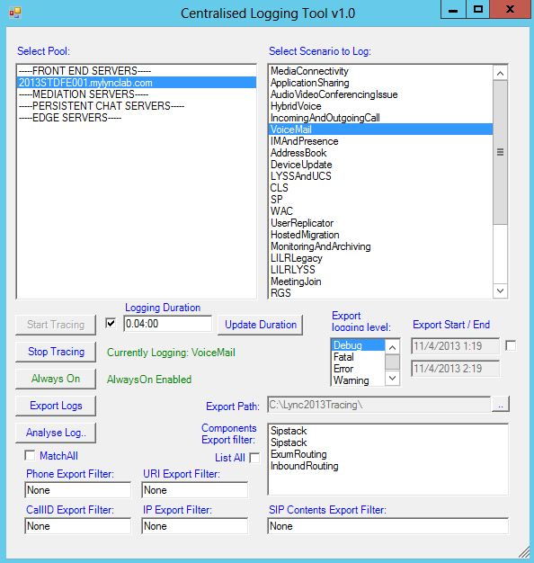 - When the tool loads it will query the Lync servers for the status of running logging scenarios, and the tool will display the current state of each pool as it is selected in the pools list. This means that you can use the tool to learn what logging is currently running on each pool.